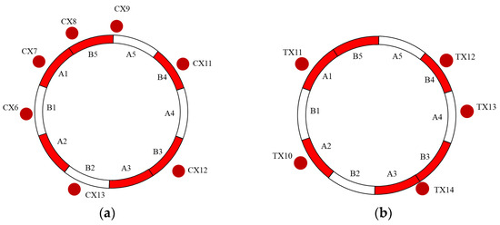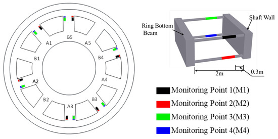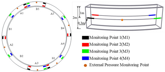 Measuring points are, respectively, set on the segments numbered A1, A2, A3, B3, B4, and B5 in the third and sixth layers of the shaft. For each segment, measuring points for the internal force are arranged on the circumferential steel bars of the inner and outer arc surfaces near its two sides. Meanwhile, external pressure measuring points are arranged at the center of the segment. Each segment has a total of four measuring points for the axial force of the steel bars and one measuring point for the external pressure. In order to distinguish the positions and names of the four internal force monitoring points, the four monitoring points are respectively numbered as M1, M2, M3, and M4, and the specific monitoring points and their distributions are shown in Figure 5.