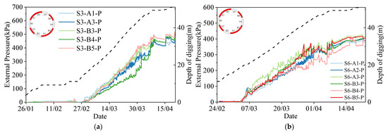Figure 8 presents the evolutions of external pressures acting on the outer surfaces of the third and sixth segmental rings during stage 1. At the beginning of stage 1, the pressures on the third and sixth rings are close to zero because only the cutting edge and the first ring segments are embedded in the stratum. As excavation advanced to depths of approximately 11 m and 19 m, the external pressures on the third and sixth rings begin to increase gradually, indicating that these segments gradually enter the main bearing zone. As the excavation continued, the interaction between the shaft structure and the surrounding soil intensified, leading to a synchronous increase in external pressure recorded at all monitoring points. When excavation reaches the design’s bottom depth, the external wall pressures on the third and sixth rings reach approximately 450 kPa and 350 kPa, respectively, showing an obvious depth correlation. Classical earth pressure theories [33,34] suggest that the pressure on retaining walls is significantly influenced by the physical and mechanical parameters of soil, especially the lateral earth pressure coefficient. However, it is noted that during the sinking process of the shaft, the external pressure does not have a direct correlation with the soil physical and mechanical parameters shown in Figure 1. This is because the slurry filling on the outer shaft wall complicates the actual soil composition acting on the shaft wall, resulting in smaller differences in external pressure exerted by soil layers with different mechanical properties on the shaft wall.
