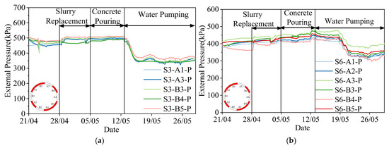 Figure 9 illustrates the evolution of earth pressure acting on the extrados of segment rings S3 and S6 during stage 2. During the slurry replacement process at the external wall of the shaft, although a slight increase in earth pressure is observed, the overall variation remains relatively slight and significantly lower than the typical characteristics of the drastic change in soil pressure before and after post-wall grouting in conventional shield construction [35]. This discrepancy can be attributed to the fact that, during shaft sinking, the annular gap around the external wall is naturally filled and compacted by the surrounding soil, forming a stable support. As a result, the slurry replacement does not substantially disturb the existing soil–structure mechanical equilibrium, thereby limiting the magnitude of pressure variation.