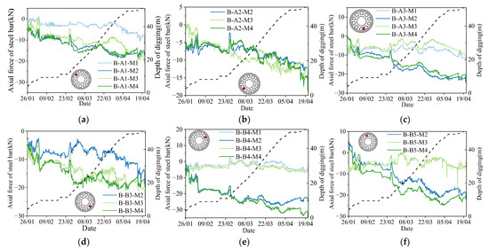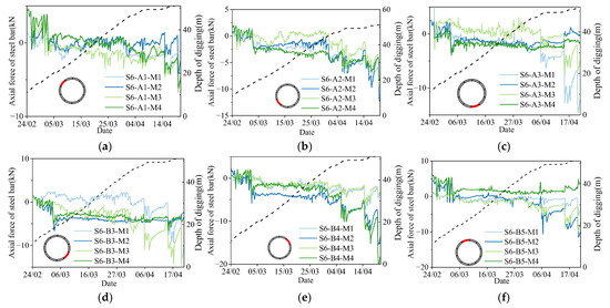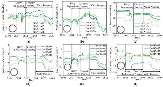 The variation in the axial force of the steel bar in the sixth ring segment during the excavation and sinking stage: (a) S6-A1; (b) S6-A2; (c) S6-A3; (d) S6-B3; (e) S6-B4; and (f) S6-B5.