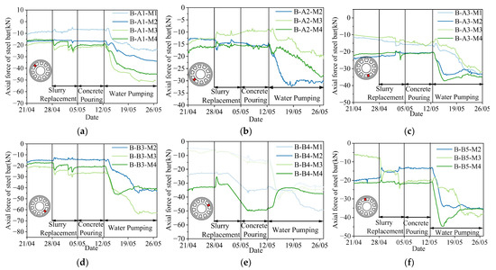Figure 11 illustrates the evolution of axial forces of steel bars at various positions along the bottom connecting beam during stage 2. Considering the deviation of sensor installation accuracy and the potential human-induced disturbances during construction, it is reasonable that there are some differences between the internal force curves of reinforcement bars at different locations. As observed in Figure 11, the slurry replacement stage behind the shaft wall exerted a relatively limited influence on the internal forces of the connecting beam reinforcement. The axial forces at all monitoring points show minor fluctuations, indicating that the external earth pressure and internal hydraulic support remained in a relatively balanced state during this period, and the structural response is stable. In contrast, the water pumping stage had a more pronounced impact on internal forces. It can be observed that the axial force of reinforcement at each monitoring point of beams A1, A2, A3, and B4 generally showed a rapid increase and then stabilized. However, it is worth noting that the axial force of measurement point M4 of beam B4 showed a significant decrease in the change pattern. This localized variation suggests that under the rigid constraint of the internal bottom ring beam, the stress distribution within the bottom connecting beam was spatially non-uniform, with evident three-dimensional structural effects and zone-specific responses.