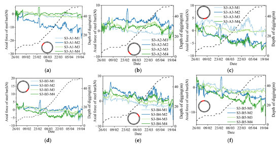 The variation in the axial force of the steel bar in the third ring segment during the excavation and sinking stage: (a) S3-A1; (b) S3-A2; (c) S3-A3; (d) S3-B3; (e) S3-B4; and (f) S3-B5.