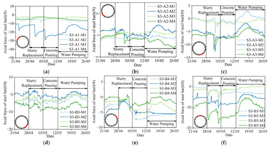 The variation in the axial force of the steel bar in the third ring segment during the concrete pouring and water pumping stage: (a) S3-A1; (b) S3-A2; (c) S3-A3; (d) S3-B3; (e) S3-B4; and (f) S3-B5.