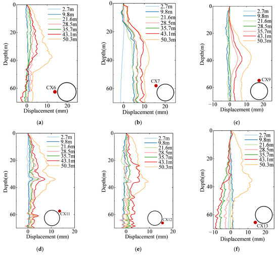 Horizontal displacement of cast-in-place piles during stage 1: (a) CX6; (b) CX7; (c) CX9; (d) CX11; (e) CX12; and (f) CX13.