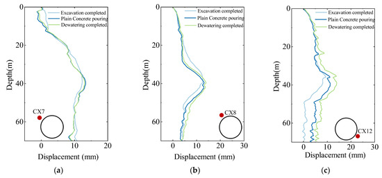 Horizontal displacement of cast-in-place piles during stage 2: (a) CX7; (b) CX8; and (c) CX12.
