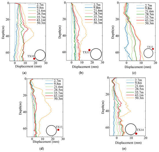 Horizontal displacement of the stratum during stage 1: (a) TX10; (b) TX11; (c) TX12; (d) TX13; and (e) TX14.