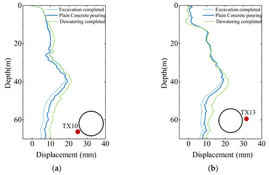 Horizontal displacement of the stratum during stage 2: (a) TX10 and (b) TX13.