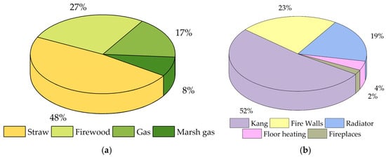 The proportion of daily cooking energy was 48% for straw, 27% for fuel wood, 17% for gas, and 8% for biogas (Figure 3a). The proportion of straw and fuel wood choices was 75%. The burning of large quantities of straw and fuel wood inevitably increases air pollution in dwellings and jeopardizes health. The choice of heating method was varied. The kang is a form of residential heating in rural China with a long history, and in our research study (Figure 3b), 52% of households used this traditional method. The proportion of fire walls associated with the kang was 23%. In addition, the proportion of fireplaces was 2%, the proportion of radiators was 19%, and the proportion of floor heating was 4%. The form of heating in winter in rural areas in Northern China is mainly based on the kang because it can also be used as a stove to fulfill the requirements of cooking and boiling water.