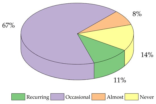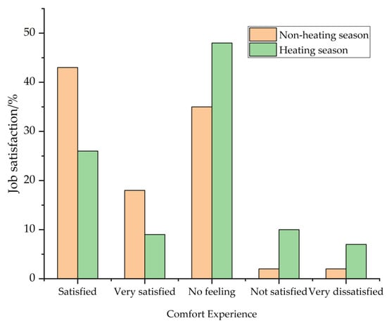 The results of the survey on residents’ satisfaction with indoor air quality showed that during the heating season, the majority of people (48%) considered their indoor air quality to be poor. The proportion of those who were satisfied was 26%, and the proportion of those who were very satisfied was only 9%. The proportion of those who were dissatisfied and very dissatisfied was 17%. In contrast, during the non-heating season, the majority of people (43%) were satisfied with their indoor air quality, and those that were very satisfied was 18%. Thirty-five percent considered their indoor air quality to be poor, and four percent were dissatisfied and very dissatisfied (Figure 5). People were more satisfied with their indoor air quality in the non-heating season than in the heating season, but 39% of the residents still found their indoor air quality to be unsatisfactory in the non-heating season.