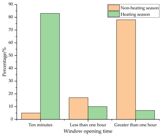 Opening windows for ventilation is the most common ventilation measure in rural dwellings. According to the results of the questionnaire survey, as illustrated in Figure 6, 74% of residents would choose to open windows for ventilation in the morning in summer, and 66% would open windows for more than one hour. In winter, the proportion of those who open windows frequently was 19%, the proportion of those who occasionally open windows for ventilation because of room odor was 43%, and the proportion of those who never open windows was 38%. A total of 71% of residents chose to open windows for ventilation in the morning when sunny, 47% would open windows for less than ten minutes, and 25% would open windows for more than one hour. In addition to opening windows for ventilation, only 21% of the residences had other measures for ventilation and air exchange, including exhaust fans or skylights. The current situation of ventilation in rural dwellings needs to be improved, not only because there is no good guidance on window opening behavior but also because there are no reasonable ventilation measures.