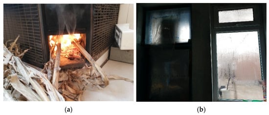 The sources of indoor air pollution in rural homes include three main areas: fuel combustion, mold growth, and interior decoration. The findings in Figure 3 show that the form of heating in winter in rural areas in the North is mainly based on the kang because the kang can also be used as a stove to fulfill the requirements of cooking and boiling water. However, this type of heating has a low combustion efficiency, resulting in incomplete combustion that can produce many harmful gases. Moreover, the thermal insulation performance of rural residential enclosures is poor, the indoor temperature in winter is significantly affected by fluctuations in the outdoor temperature, the overall indoor temperature is low, and the relative humidity is high; these factors make it easy for molds and other microorganisms to grow. Figure 7 shows the smoke produced when a stove is used for heating and cooking combustion, accompanied by the production of a large amount of water vapor in the room. As the standard of living in rural areas has improved, the extensive use of man-made panels, decorative materials, and paint for indoor decoration has brought new sources of pollution to indoor air quality. All these pollutants are prevalent in dwellings in rural areas in Northern China, affecting people’s health and quality of life.