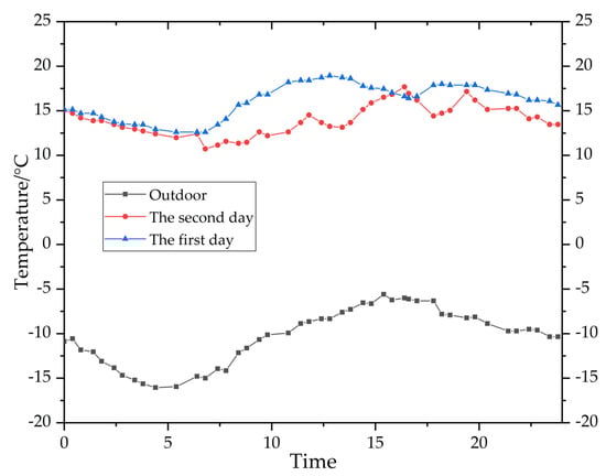 Figure 8 shows the indoor and outdoor temperature profiles. The lowest average outdoor temperature for both days was −15.0 °C, which occurred at 5:00 p.m. The highest average temperature of −5.6 °C occurred at 15:30 p.m. The indoor temperature trend was the same as the outdoor temperature trend, but there was a delay in time, and the indoor temperature fluctuation was delayed by approximately 1 h compared with the outdoor temperature fluctuation. On the first day, the interior was closed, and the indoor temperature was significantly higher than that on the second day. The minimum indoor temperature was 12.6 °C, and the maximum temperature was 18.9 °C. The trend of the indoor temperature on the first day was closer to the trend of the outdoor temperature. On the second day of testing, the indoor temperature decreased significantly compared with that on the first day because of the intermittent opening of windows in the room. The minimum indoor temperature was 10.7 °C, and the maximum temperature was 17.68 °C. The cooking times were approximately 6:00, 12:00, and 17:00; during this period, the cold outdoor air invaded the room, causing indoor heat loss, and the temperature suddenly decreased at these three time points. Compared with the trend of temperature change on the first day, the whole temperature profile was more volatile.
