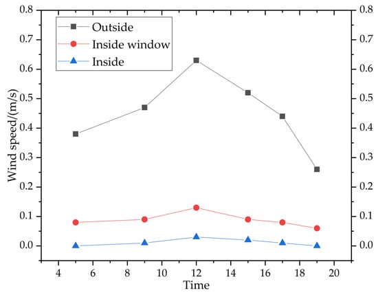As shown in Figure 9, the indoor and outdoor wind speeds were measured at three locations: outdoors, on the inside of the window, and indoors. The outdoor wind speeds were higher in winter, and the local wind speeds were mostly at breezes of magnitude 2–3. The airtightness of the windows of rural houses is poor, and the wind speed inside the windows was obviously greater than the indoor wind speed. The indoor wind speed was approximately 0. During the cooking of three meals a day, there were significant fluctuations in the indoor wind speed during the cooking period, as there was the act of burning a fire in the kitchen, which was often accompanied by opening windows for ventilation.