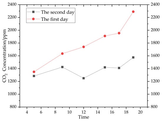 The magnitude of indoor CO2 concentration is an important parameter for measuring indoor air quality. On the first day, the windows were closed tightly and the CO2 produced in the residence could not be vented; thus, the concentration of CO2 gradually increased. The burning of large amounts of wood fuel for heating and cooking in winter resulted in a high overall indoor CO2 concentration in winter. At approximately 17:00, the indoor CO2 concentration reached more than 2000 ppm, exceeding the safety limit in the code to the extent that it jeopardizes the health of the residents []. On the second day of the test, the windows were opened in accordance with the normal living habits of the residents, the natural ventilation allowed CO2, smoke, and other gases to be expelled, and the indoor CO2 concentration was effectively reduced. This phenomenon would be better improved if burning wood was not used for heating in the house.