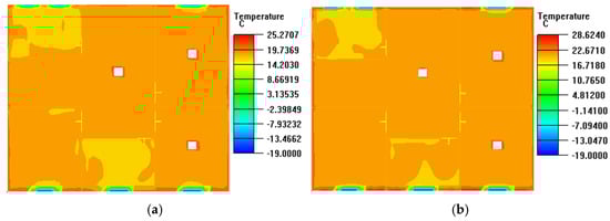 In the simulation process, fresh air relies on only recovered heat preheating without additional heat treatment. There is little difference between the room temperatures under the two simulated conditions. As shown in Figure 11 and Figure 12, compare the changes in temperature and humidity. The average indoor temperature in the room with the fresh air heat recovery system was 22 °C, and the average humidity was 35%. The indoor air was drier with the radiant floor heating system. The relative humidity in the room without a ventilation and air exchange system was approximately 35%. The relative humidity in a room with a ventilation and air exchange system is more suitable.