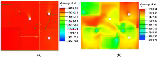 Cloud view of the changes in indoor air age. (a) Mean age of air in an unventilated room; (b) mean age of air in a ventilated room.
