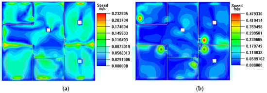 Cloud view of the changes in indoor air speed. (a) Air speed in an unventilated room; (b) air speed in a ventilated room.