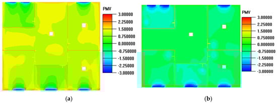 Changes in indoor PMV values. (a) PMV in an unventilated room; (b) PMV in a ventilated room.