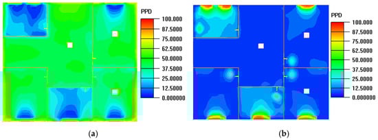 Changes in indoor PPD values. (a) PPD in an unventilated room; (b) PPD in a ventilated room.