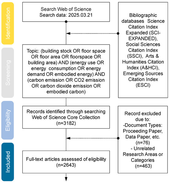 To effectively map the landscape and emerging hotspots of BSECER research, this study followed established bibliometric methodologies for data collection and preliminary analysis. The Web of Science (WOS) Core Collection was selected as the primary database and included four indices: the Science Citation Index Expanded (SCI-EXPANDED), Social Sciences Citation Index (SSCI), Arts & Humanities Citation Index (A&HCI), and Emerging Sources Citation Index (ESCI). Given the generally greater academic rigor and depth of peer-reviewed journal articles, this study limited the search to research articles, review articles, and early access publications [27]. This study used a series of concepts or topics related to building stock, energy consumption, and carbon emissions as search terms, and the wildcard “AND” was added to ensure search inclusiveness.