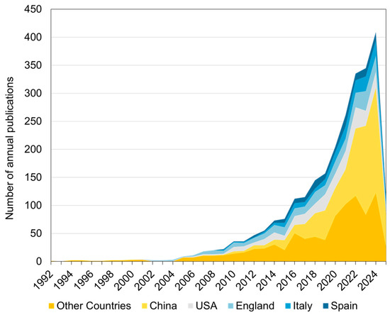 Our findings (Figure 2) show that research on BSECER has evolved in distinct phases. The earliest literature dates back to 1992, followed by a long period of limited activity. An increase occurred in 2005, likely in response to the entry into force of the Kyoto Protocol, which imposed binding emission reduction targets on signatory countries, catalyzing research into energy efficiency in the building sector [28]. This was further amplified by preparations for the IPCC Fourth Assessment Report and the IEA’s evaluation of building energy efficiency policies [29].
