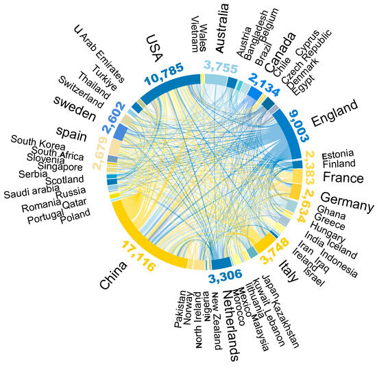 Global research on BSECER has a three-tier citation structure (Figure 3). China leads with 17,116 citations (31.2% of the global total), driven by both a high number of publications (601 articles) and improved research quality. The United States (10,785 citations) and the United Kingdom (9003 citations) followed, together accounting for 67.3% of global citations and forming a “golden triangle” of knowledge influence.