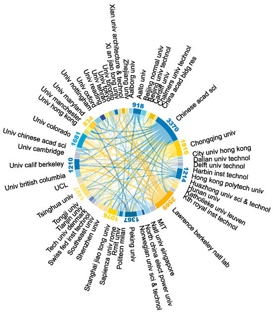 A time series analysis based on average publication years (2017–2023) indicates that the research peak for traditional European and American institutions (e.g., Oxford University and UC Berkeley) was concentrated between 2017 and 2019, with average citation counts ranging from 76 to 120. In contrast, Chinese institutions (e.g., the China Academy of Building Research and Hunan University) have shown increased activity from 2021 to 2023. Notably, Hong Kong Polytechnic University (average publication year: 2021) maintains high-intensity collaboration with MIT (intensity 2) and Tsinghua University (intensity 1), suggesting the emergence of a new east–west knowledge flow pathway. Citation analysis reveals that while American institutions such as the University of Colorado produce fewer papers (total intensity: 7), their average citation count is high (120), aligning with the elite innovation diffusion model. Conversely, the broader collaboration network and greater output of Chinese institutions (e.g., 59 publications from the Chinese Academy of Sciences) exemplify a scale–network synergy effect.