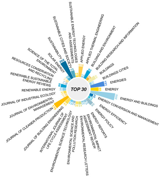 The research on BSECER exhibits a clear trend of journal centralization, as shown in Figure 5. Energy and Buildings holds an overwhelmingly dominant position, publishing 265 articles (9.996%), far surpassing other journals and highlighting its authoritative status in building energy research. This journal has long focused on building energy simulation, energy-saving technologies, and policy evaluation, becoming the preferred publication platform in the field. Sustainability (202 articles) and the Journal of Cleaner Production (175 articles) emphasize sustainable development and life cycle analysis, together forming a tripartite framework of technology, environment, and policy. Journals such as Applied Energy (112 articles) and Building and Environment (93 articles) also show strong performance in specialized areas such as energy system optimization and the physical environment of buildings, collectively shaping the core knowledge dissemination system.