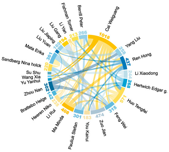 This study employs social network analysis to examine the structure and evolution of author collaboration in the BSECER field (Figure 6). The collaboration network demonstrates multicentered clustering. Chinese scholar Cai Weiguang (total connection strength: 38; 18 publications) and European scholar Hertwich Edgar G. (international cooperation strength: 13) anchor the field’s two major nodes in East China and West China, forming a bipolar leadership pattern. Chinese scholars are further subdivided into three regional clusters: Beijing, South China, and emerging young scholars. In contrast, European scholars exhibit a greater tendency for cross-border collaboration, such as between Norwegian and Swiss researchers. This reflects the regionally differentiated development of building energy efficiency research.
