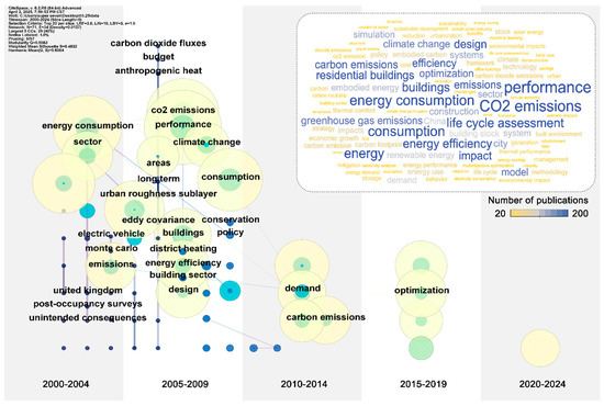 From the time zone chart of keywords (see Figure 7), the core direction of research on BSECER centers on energy efficiency improvement and carbon emission control. High-frequency keywords such as “performance” (377 times), “CO2 emissions” (335 times), and “energy consumption” (293 times) clearly reflect this focus. Moreover, “lifecycle assessment” (232 times) and “energy efficiency” (211 times) indicate that life cycle thinking and optimization remain the primary research methods. At the technical level, studies predominantly focus on energy management (255 times for “energy” and 107 for “renewable energy”), emission control (160 for “carbon emissions” and 149 for “climate change”), and optimization strategies (162 for “optimization” and 125 for “simulation”).
