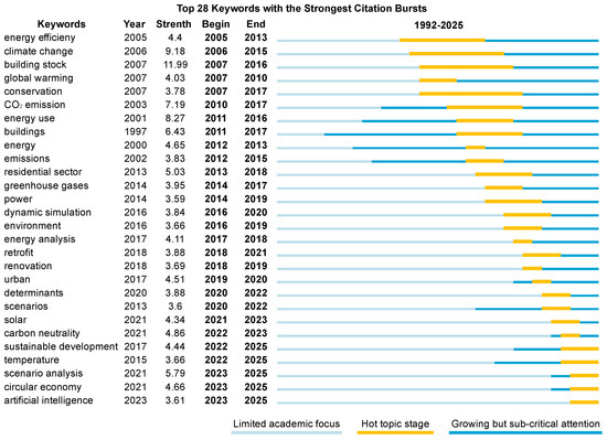 From a temporal perspective, the staged emergence of keywords is consistent with the features of the time zone map. The evolution of research hotspots in energy conservation and emission reduction for building stock reveals three distinct development stages, identifiable through keyword burst intensity analysis (see Figure 8).