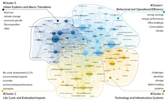 Traditional research has focused primarily on energy consumption during the operational stage of buildings, whereas the current trend is gradually shifting toward full-life-cycle carbon emission analysis. The high frequency of keywords such as “embodied carbon” and “life cycle assessment (LCA)” indicates that scholars are increasingly emphasizing the carbon footprint associated with building material production, construction, and demolition.