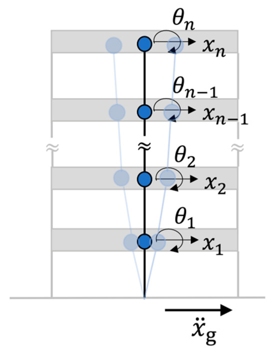 A simplified building model using a lumped-mass representation is illustrated in Figure 2, where each floor is modeled as a single node with one translational degree of freedom in the horizontal direction and one rotational degree of freedom. Since floor slabs are assumed to behave as rigid diaphragms, all in-plane displacements are slaved to the translational and rotational DoFs at the center of mass (i.e., lumped mass). Therefore, the total number of active DoFs equals twice the number of floors. The story stiffness is comprised of the column stiffness based on the Euler beam theory and the upper and lower floor flexural stiffness of the system (i.e., rotational stiffness contributed from beams and floors). Most building models developed in past studies consider only lateral displacements and neglect the effects of rotational deformation. In this study, the inclusion of rotational DoF allows for a more realistic representation of structural deformation behavior. The equation of motion of the building is given by