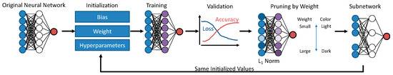 A dense neural network array can be more computationally efficient and more feasible for practical applications. Most neural networks have many neurons with zero weights, and then the neural network branches can be pruned and compressed [33]. Thus, the Lottery Ticket Hypothesis assumes that some subnetworks in a dense neural network can provide similar test accuracy with fewer parameters (i.e., neurons). The subnetworks can be iteratively pruned from the original neural network, as shown in Figure 4. After training the original network, the neuron participation is calculated through L1 norm such as