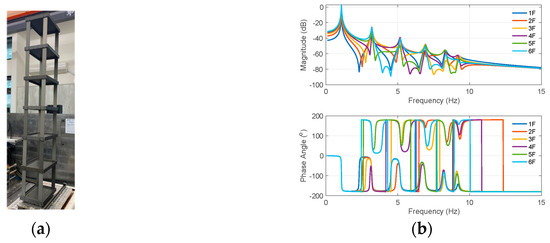 Six-story building model used in the numerical study: (a) photo and (b) frequency response functions.
