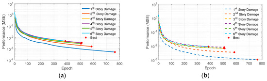 As shown in Figure 6, the low mean square errors (MSEs) across the six networks indicate that the models are successfully trained. After converting the predicted values back to the 0–90% stiffness reduction range, the root-mean-square errors (RMSEs), evaluated on the test dataset, are 1.43%, 2.65%, 3.69%, 4.22%, 3.70%, and 4.26% for the first through sixth stories, respectively, demonstrating the effectiveness of the neural network array in estimating damage.