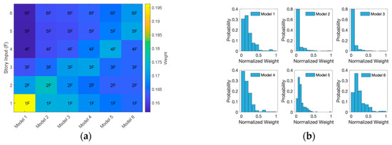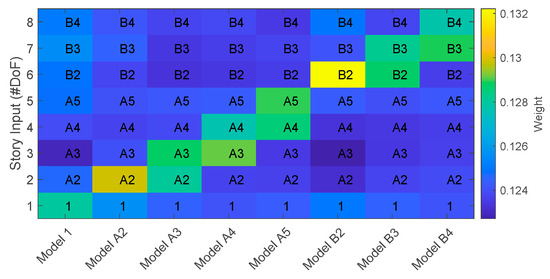 Figure 7a illustrates neuron weight participation across the original neural network array using the L1 norm. The L1 norm of input layer weights reflects the relative sensitivity of FRF phase responses to damage in specific stories. For example, in Model 1, the phase responses from the first and second stories exhibit notably higher weight magnitudes, suggesting greater influence in estimating first-story damage. In contrast, Model 6 shows a more uniform distribution of input weight contributions, indicating that all floor responses contribute similarly to sixth-story damage prediction.