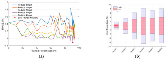 Figure 8a shows that the RMSE on the test dataset for Model 1 varies with different pruning percentages of the network weights. Each curve corresponds to a specified number of input story responses that are removed before applying parameter pruning. The results indicate that input selection has a significant influence on accuracy, with the model pruned by removing three input responses achieving the lowest RMSE on the test dataset. In contrast, the model without input reduction shows the highest RMSE. This proves that pruning not only reduces the network size, but also improves prediction performance, as evidenced by a decrease in RMSE. This improvement is attributed to the reduction in model complexity and overfitting risk. By eliminating redundant inputs and low-contributing neurons, the network becomes more focused and generalizable. This outcome aligns with the findings of Frankle and Carbin [28], who demonstrated that smaller, well-initialized subnetworks can match or exceed the performance of larger, overparameterized models.