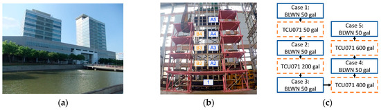 Damage detection experiment of the twin-tower building: (a) photo of the as-built building, (b) scaled twin-tower model building, and (c) test plan.