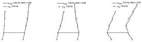 where is a vector of factors that tune the story stiffness; is the i-th mode shape corresponding to the natural frequency ; the subscripts “m” and “e” indicate the modal properties extracted from the simplified model and experiment, respectively. Note that the experimental modal properties are identified from the frequency-domain subspace system identification [38]. As shown in Figure 11, the numerical mode shapes have a good agreement with the identification results, and the overall modal assurance criterion (MAC) values [39] are over 0.97.