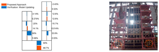 Figure 13 compares the estimated story stiffness reduction percentages obtained using the proposed method and the conventional model updating technique by Equation (10) for test plan Case 5. In the first story, the proposed method and model updating estimate stiffness reductions of approximately 88% and 90%, respectively. These estimates are consistent with the observed buckled braces, as shown in the corresponding photograph, where material properties yield a theoretical reduction of around 73%.