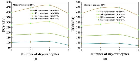 - The variation trends of UCS in flowable waste soils with different moisture contents with the dry–wet cycle are similar, both increasing first and then decreasing. When the moisture content is 58% or 60%, the UCS of the sample is the largest after the sixth dry–wet cycle. With the progress of the dry–wet cycle, the maximum value of UCS in the sample appears earlier and earlier. When the moisture content is 64%, the maximum value of UCS occurs in the third dry–wet cycle. After the ninth dry–wet cycle, the UCS of all samples was lower than the initial UCS, and the maximum strength loss was 26.21%