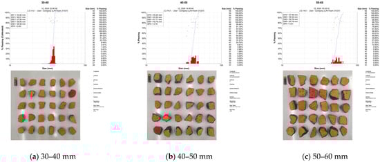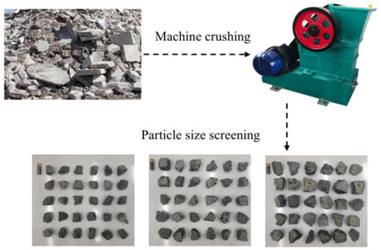In this experiment, the influence of water-to-binder ratio and aggregate size of the waste concrete on the mechanical properties of the desert sand mortar cemented waste concrete filling material was investigated, while maintaining a constant content of desert sand. Aggregate sizes of the waste concrete were categorized into three groups: 30–40 mm, 40–50 mm, and 50–60 mm. These classifications were conducted using WipFrag 3.3 particle-size analysis software, as illustrated schematically in Figure 3.