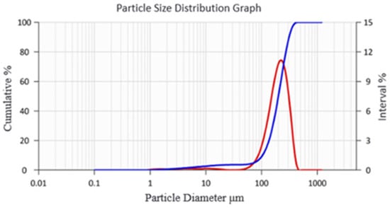 (4) Desert sand: Desert sand was collected from suburbs near Urumqi and analyzed by Dandong Better Instrument Co., Ltd., Dandong City, China. using a laser particle-size analyzer. The sand had a volumetric mean diameter of 201 μm and a numerical mean diameter of 1.5 μm. The particle size distribution is illustrated in Figure 2, where the blue curve represents the cumulative distribution and the red curve denotes the interval distribution.