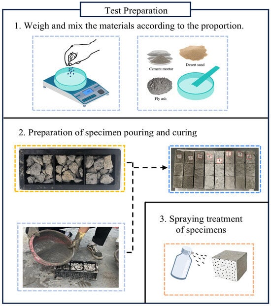 - Casting and curing: Waste concrete aggregates were manually and randomly placed into molds, simulating the natural, random filling pattern typical of backfilling open-pit mine voids, thus ensuring the realism and validity of the experiment. The prepared mortar was slowly poured into the mold from a fixed corner, allowing it to naturally infiltrate and fill gaps solely by gravity, without external vibration or compaction. Specimens were cured under standardized conditions at constant temperature and humidity (20 ± 2 °C, 95% RH) for 28 days. After curing, specimens were demolded, labeled, and organized neatly.