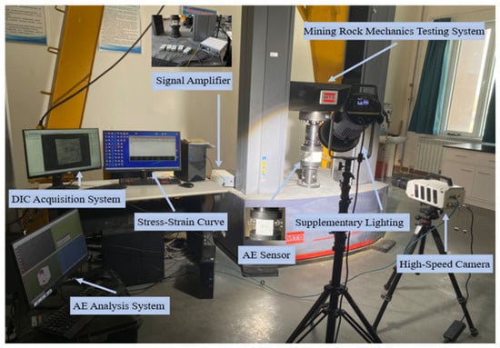 According to the standard GB/T50081-2019 [], Standard Test Methods for Physical and Mechanical Properties of Concrete, a mining rock mechanics testing system was employed to conduct uniaxial compression tests. The displacement-controlled loading method was adopted, with a displacement rate of 0.5 mm/min. To capture the influence of aggregate particle size on crack initiation and propagation, digital image correlation (DIC) was used to record the full-field surface strain evolution of the specimens, while acoustic emission (AE) technology monitored the internal micro-fracturing signals. By analyzing localized strain patterns and AE frequency-domain energy distribution, the differences in damage accumulation and failure mechanisms among specimens with different aggregate sizes were quantitatively evaluated. The experimental setup is shown in Figure 5.