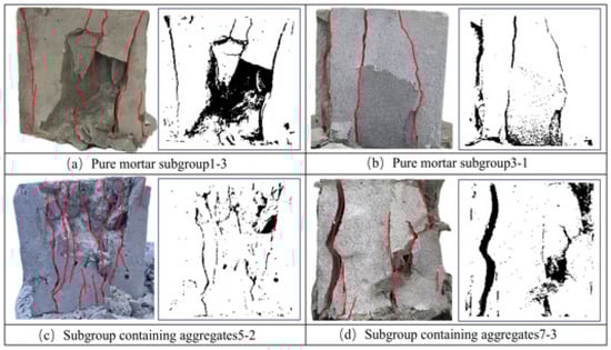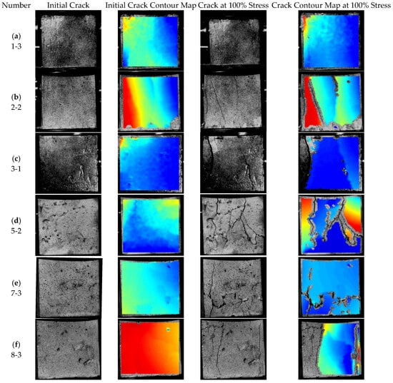 Speckle-image displacements recorded by digital image correlation (DIC) trace surface crack growth during compression. Six specimens were examined: three pure mortars with different water-to-binder ratios and three aggregate-containing mortars with different particle sizes. The specimen in each subgroup whose peak strength was closest to the group mean was selected for a detailed study. Figure 10 outlines how the initial cracks progressed to the fully loaded state, defined here as one hundred percent of peak stress.