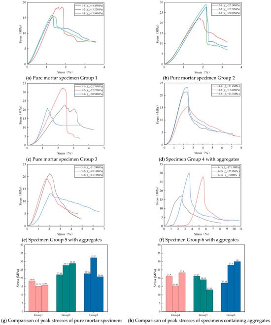 (1) Different water-to-binder ratios: Figure 7 presents a comparison of peak strengths at varying water-to-binder ratios, involving a total of eighteen specimens divided into six groups: three pure mortar groups and three groups containing aggregates. Among the pure mortar groups, Group 1 exhibited a maximum stress of 18.45 MPa and an average strength of 16.54 MPa, while Group 2 demonstrated a significantly improved performance, with a maximum stress of 28.89 MPa and an average strength of 26.25 MPa. Group 3 reached a slightly higher maximum stress of 32.27 MPa but had a lower average strength (25.32 MPa) compared with Group 2. Thus, the mix ratio of Group 2 emerged as the optimal choice for pure mortar specimens, outperforming Group 1 by 58.7% and marginally surpassing Group 3 by approximately 4% in terms of average strength. Among the aggregate-containing groups, Group 4 attained a maximum stress of 23.3 MPa with an average of 20.04 MPa, whereas Group 5 yielded a maximum stress of 21.24 MPa and an average strength of 17.86 MPa. Group 6 significantly outperformed both, achieving a maximum stress of 30 MPa and an average strength of 25 MPa. Consequently, the water-to-binder ratio of Group 6 proved the most effective in enhancing the compressive strength among the aggregate-containing specimens. Overall, Groups 3 and 6 provided the most favorable water-to-binder ratios across all specimen types.