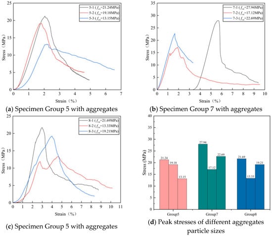 (2) Different aggregate particle sizes: In Figure 8, the effects of different aggregate particle sizes on peak strength were compared for Groups 5, 7, and 8. Group 5 (aggregate size of 30–40 mm) recorded a maximum stress of 21.24 MPa with an average strength of 17.86 MPa. Group 7, utilizing aggregates sized 40–50 mm, demonstrated a superior performance with a maximum stress of 27.94 MPa and an average strength of 22.58 MPa. Group 8, with aggregates of 50–60 mm, achieved a maximum stress of 21.69 MPa and an average strength of 18.08 MPa. The results indicated that aggregates sized between 40 and 50 mm significantly enhanced the mechanical performance, with the Group 7 specimens showing average strength improvements of 26.43% over Group 5 and 24.89% over Group 8.