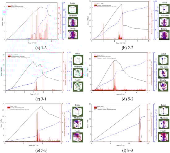 Acoustic emission (AE) signals originate from internal structural changes during compression, and therefore, the collected AE waveforms accurately reflect the internal crack development within the specimens. AE signals from loading tests were collected for six groups of specimens including pure mortar subgroups with different water-to-binder ratios and aggregate-containing subgroups with varying particle sizes. For each subgroup, the specimen with peak strength closest to the subgroup mean was selected as representative. The results are shown in Figure 9, with the damage process divided into three distinct stages.
